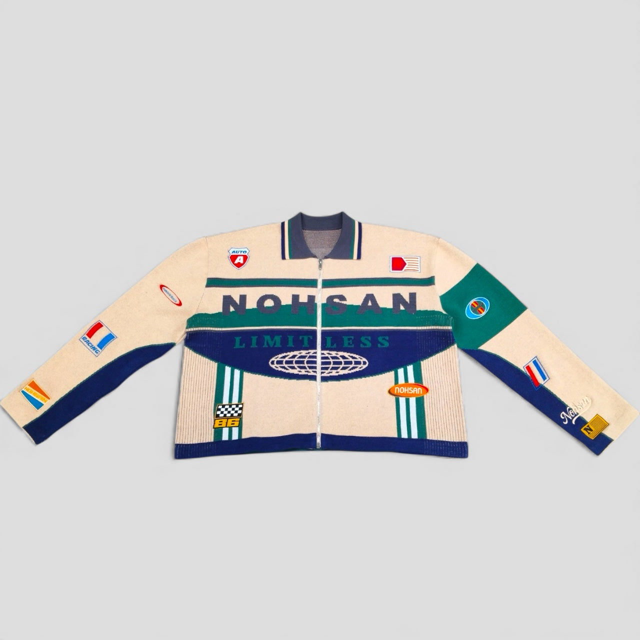 Built for speed, style, and substance. The Human Race Knit Moto Jacket fuses motorsport energy with luxury streetwear craftsmanship. Knitted from heavyweight 100% cotton core spun yarn, this piece delivers structure, warmth, and durability without sacrificing comfort. A collage of jacquard graphics and branded embroidered patches runs across the body and sleeves, celebrating racing heritage and human ambition. Finished with a double-zip closure for versatility, the jacket embodies Nohsan’s ethos: limitless movement, timeless design.
