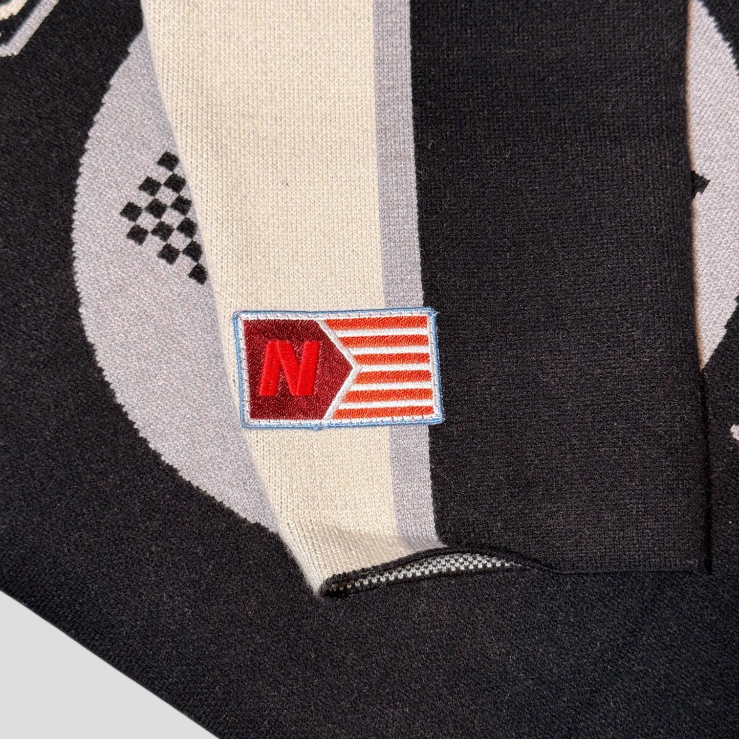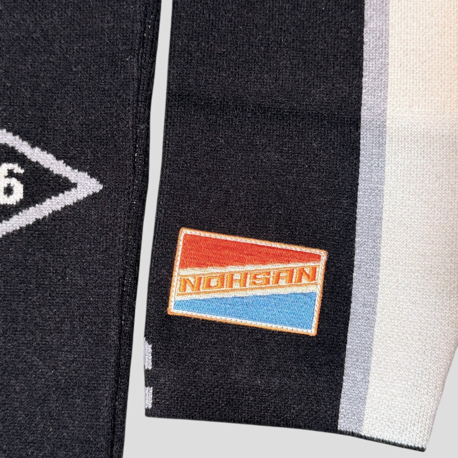 Built for speed, style, and substance — the Human Race Knit Moto Jacket fuses motorsport energy with luxury streetwear craftsmanship. Knitted from heavyweight 100% cotton core spun yarn, this piece delivers structure, warmth, and durability without sacrificing comfort. A collage of jacquard graphics and branded embroidered patches runs across the body and sleeves, celebrating racing heritage and human ambition. Finished with a double-zip closure for versatility, the jacket embodies Nohsan’s ethos: limitless movement, timeless design.